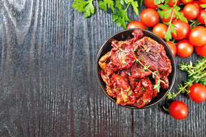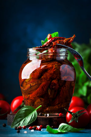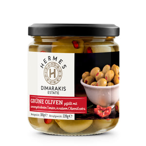 Die Oliven stammen aus dem Norden Griechenlands und werden sorgfältig per Hand gepflückt und per Hand mit sonnengetrockneten Tomaten befüllt.