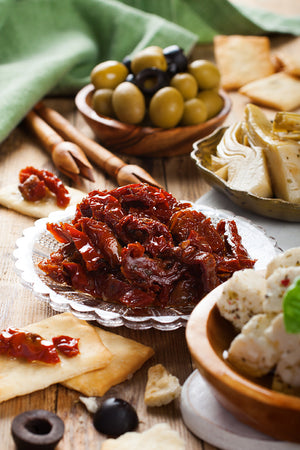 Unsere grünen Oliven sind saftig-nussig und mit aromatischen, sonnengetrockneten Tomaten gefüllt. Die Kombination dieser beiden Zutaten ist ein unvergleichlicher mediterraner Genuss und darf auf keinem Vorspeisenteller fehlen.